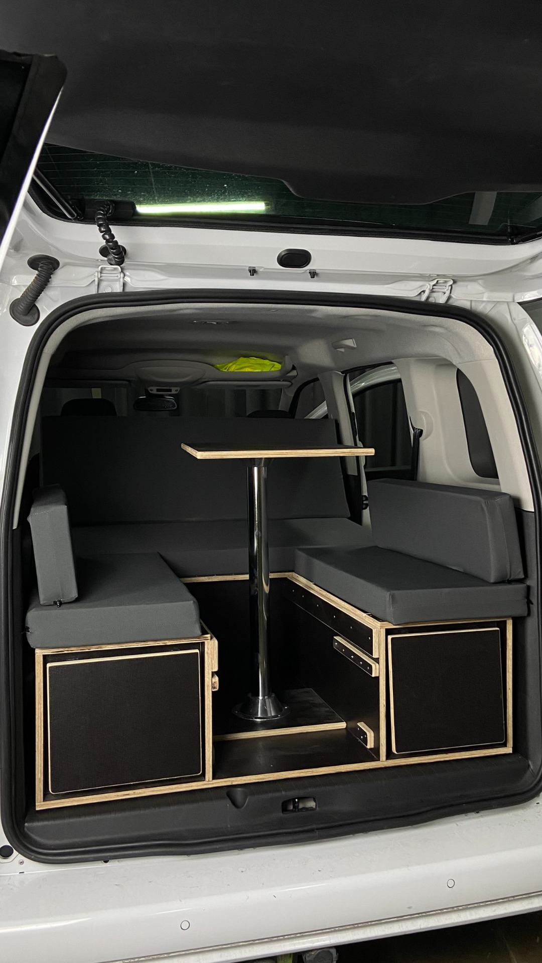 Si compone di tutto ciò che si vede in foto: Letto in orizzontale e in posizione "amaca, divano", Cassetto personalizzato per cucina Campingaz e spazio per l'essenziale e cibo secco, Tavolo valido per interni ed esterni, baule o Top e apertura frontale bauli portabagagli.