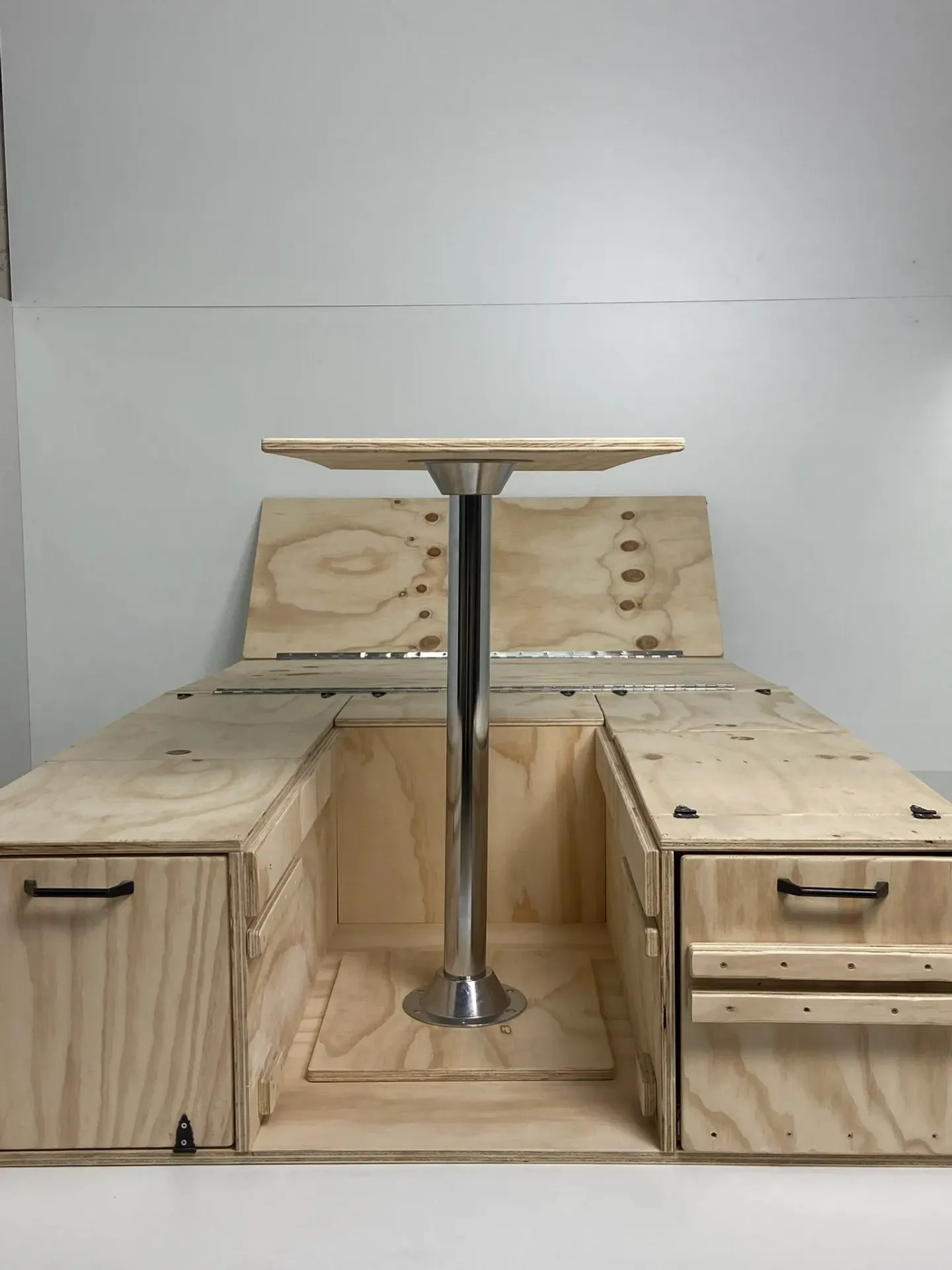 Consta de todo lo que se ve en la fotografia. Cama, Cajón a medida para cocina Campingaz, Mesa valida para interior y exterior y baul compartimento para equipaje con apertura superior y frontal.